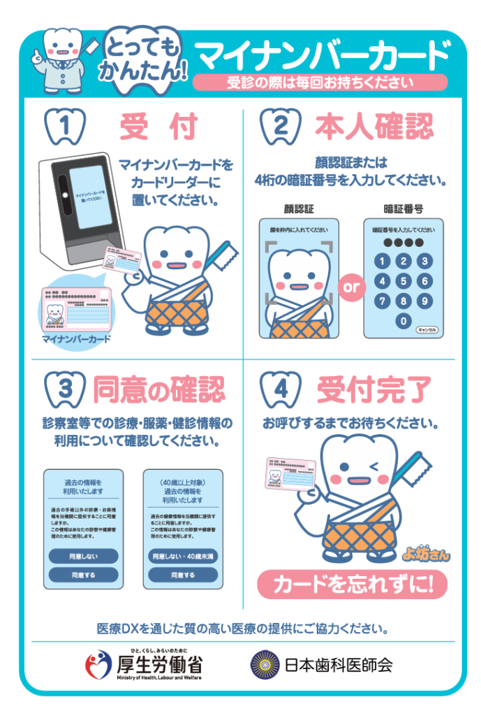 今まで保険証は月初めのみの提示でしたがマイナンバーカードは毎回機械に通していただかなければなりません。ご協力宜しくお願い致します。